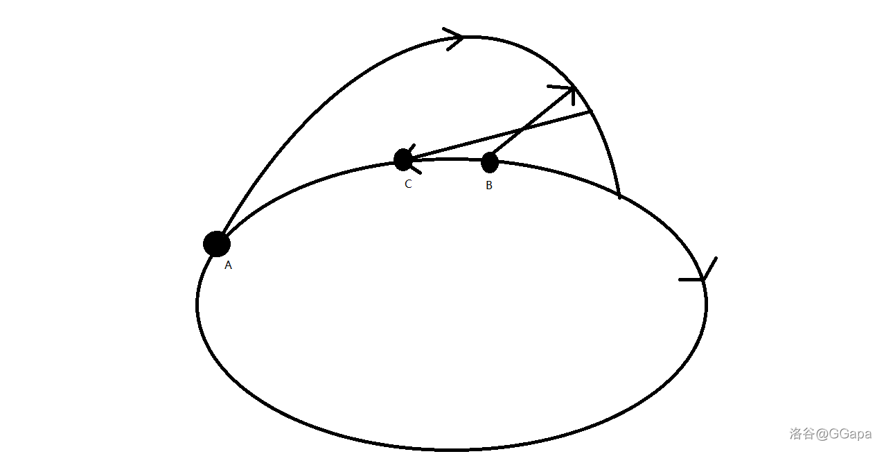 但请读者认真思考一下便会发现上述证明其实是有误的,因为对于两个不同的节点 $A$ 和 $B$ 他们对 “远” 的定义不同,对于一个在 $A$ 和 $B$ 之间的节点 $C$,在 $A$ 作为起点时 $dis(A, C)$ 是要小于 $dis(B, C)$ 的,但在第一次访问的时候 $C$ 并不是访问到最远的节点,如下图所示: